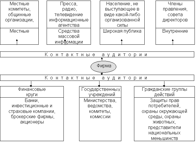 С точки зрения содействия или противодействия предприятию в достижении его целей контактные аудитории классифицируются на искомые, благотворные и нежелательные.