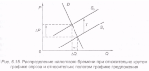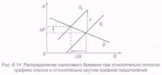 Это означает большую степень изменчивости спроса, чем предложения, при изменении цены. В данном случае цена товара растет значительно слабее, чем величина налога, т.е. большая часть налога выплачивается продавцами, а меньшая - потребителями.