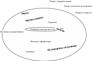 В этой связи Теодор Левитт, один из идеологов современного маркетинга, уверял, что потребители “приобретают не сверла диаметром в четверть дюйма, а отверстия того же диаметра”. Потребителю нужна не зубная паста, а здоровые зубы и свежий запах изо рта. Женщина приобретает не крем для лица, а увлажнение кожи; находясь в салоне красоты, она лишь на первый взгляд делает стрижку и окраску волос, а на деле приобретает красоту, молодость и уверенность в себе. “Лада” - недорогое функциональное транспортное средство, а “BMV” (тоже автомобиль) - символ престижа и преуспевания. Обед в ресторанах McDonald’s - способ быстро перекусить в приличных условиях, с гарантированным стандартным качеством пищи. Фильм в кинотеатре - это способ развлечения, возможно, из того же ряда, что прогулка по набережной, посещение кафетерия, чтение детектива А. Конан Дойла или поход на футбол. Суть такого товара, как мотоцикл, - скорость и свобода. Суть йогурта - удовольствие и польза. Суть пищевого оборудования не в технических характеристиках, габаритах и весе - это стабильный пищевой бизнес. Ну а мыло приобретают для чистоты. Другим словами в каждом перечисленном случае потребитель получает то, в чем была его нужда, потребность, выделяя товар по комплексу осязаемых и неосязаемых свойств, включающих в себя упаковку, цвет, цену, престиж производителя или торговца. Для потребителя важно не предложение, а скорее субъективный способ его восприятия. На подобных рассуждениях Ф.Котлер устанавливает схему определения товара на трех уровнях: «замысла», «реального исполнения» и «подкрепления» (рис. 3.1).