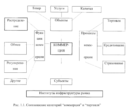 Экономическая категория «коммерция» может рассматриваться как широкая социально-экономическая система, включающая в себя торговлю как подсистему. Коммерция может осуществляться в различных сферах хозяйственной деятельности и не только на товарных рынках средств производства и предметов потребления, но и на рынке услуг и рынке капиталов. Иерархическая связь данных экономических категорий представлена на рис. 1.1. Различия между ними обнаруживаются при рассмотрении объектов, субъектов, функций и процессов коммерции. Если объектами торговли являются, в основном, товарно-материальные ценности, имеющие товарную форму, то в состав объектов коммерции помимо товаров включены услуги и капитал. Услуга, как объект купли-продажи, с одной стороны, совпадает с объектами торговли, а с другой стороны, способствуя более полному удовлетворению потребностей клиентов, является продуктом коммерции. Капитал как объект коммерции включает: кредитные ресурсы для коммерческих операций; финансовое страхование коммерческих сделок; коммерческие операции на рынке ценных бумаг; другие формы использования капитала в коммерции. Различие между торговлей и коммерцией по субъектам заключается в том, что в торговый процесс вовлечены в основном торговые посредники и в меньшей степени, чем в коммерцию, вовлечены кредиторы и страхователи.