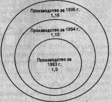 К рассматриваемому виду диаграмм относится графическое изображение, полученное путем построения один в другом квадратов, кругов или прямоугольников с различной заштриховкой или закраской. Такие диаграммы также позволяют сравнивать между собой ряд исследуемых величин. На рис. 7 показан такой вариант круговой диаграммы.