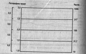 Необходимо найти логарифмы исходных чисел, начертить ординату и разделить ее на несколько равных частей. Затем нанести на ординату (или равную ей параллельную линию) отрезки, пропорциональные абсолютным приростам этих логарифмов. Далее записать соответствующие логарифмы чисел и их антилогарифмы, например (0,000; 0,3010; 0,4771; 0,6021;...; 1,000, что дает 1, 2, 3, 4,..., 10). Полученные антилогарифмы окончательно дают вид искомой шкалы на ординате.