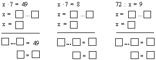 Заполняя свободные клетки справа налево, учащиеся в каждом уравнении находят неизвестный компонент действия, приемы нахождения которых изучены во втором классе.В дальнейшем прием решения составных уравнений закрепляется в игре , в которой один ученик выполняет роль , а второй - роль контролера.