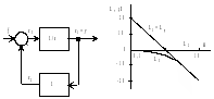 Рассмотрим пример системы, образованной интегрирующим звеном, охваченным единичной отрицательной обратной связью (рис.20, а). На рис.20, б изображены ЛАЧХ L1 и L2 этих звеньев. На частотах < 0,1 с-1 усиление контура превышает 20 дБ.