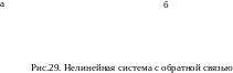 Простейший пример такой модели – нелинейный интегратор dy/dt = F(x) структурно изображается как последовательное соединение безынерционного НЭ и линейного интегрирующего звена (рис.28). На рис.29, а изображен другой пример – модель системы с обратной связью в форме структурной схемы, а на рис.29, б та же модель представлена в форме сигнального графа, одна из дуг которой помечена двумя штрихами, указывающими на нелинейный характер преобразования сигнала.