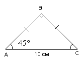 Запись на доске: Найдите площадь равнобедренного прямоугольного треугольника с основанием 10 см и углом при основании