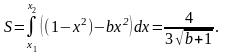 Решение: Найдем абсциссы точек пересечения параболы и прямой. Для этого решим уравнение (3) или (4). Так как дискриминант > 0 то уравнение при все значениях параметра будет иметь 2 корня x1 и x2. Вычислим площадь фигуры ограниченную линиями 1) и 2). Ее так же вычисляем с помощью определенного интеграла с пределами интегрирования x1 и x2.