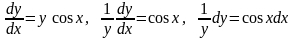 Решение. Правая часть уравнения представляет собой произведение двух функций, одна из которых зависит от х, а другая от у. Следовательно - это уравнение с разделяющимися переменными. Выразим производную через дифференциалы и разделим переменные: