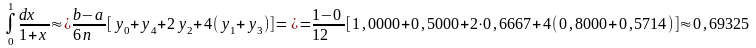но теперь по формуле Симпсона при n=4. Разобьем отрезок [0, 1] на четыре равные части точками х0=0, х1=1/4, х2=1/2, х3=3/4, х4=1 и вычислим приближенно значения функции f(x)=1/(1+x) в этих точках: у0=1,0000, у1=0,8000, у2=0,6667, у3=0,5714, у4=0,5000.