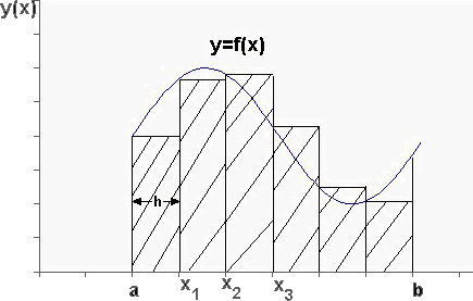 Для вычисления этой площади весь интервал интегрирования [a,b] разбивается на n равных подинтервалов длины h=(b-a)/n. Площадь под подынтегральной кривой приближенно заменяется на сумму площадей прямоугольников, как это показано на рисунке (2).
