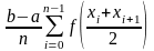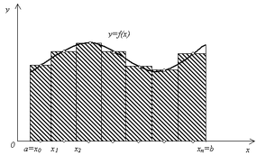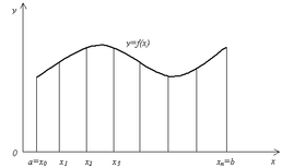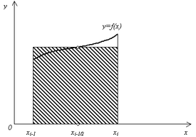 Эта фигура состоит из n прямоугольников. Основание i-го прямоугольника образует отрезок [xi, xi+1] длины h, а высота основания равна значению функции в середине отрезка [xi, xi+1], т е. f