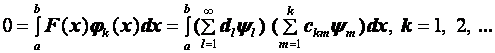 Это дает алгебраическую систему уравнений для определения коэффициентов ak. Найдя из нее коэффициенты, получим приближенное решение.