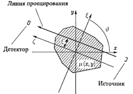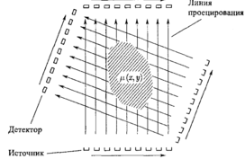 при просвечивании объекта излучением внешнего источника. Источник излучения проходит дискретно вдоль объекта. Синхронно с источником с другой стороны объекта движется детектор излучения. Набор отсчетов, полученный таким образом, определяет одномерную функцию, называемую проекцией. Затем система «Источник-детектор» поворачивается относительно объекта на некоторый угол
