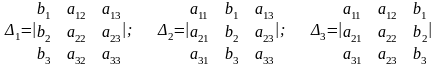 Введем два д о п о л н и т е л ь н ы х о п р е д е л и т е л я , которые получаются из определителя системы заменой одного из столбцов столбцом свободных членов:
