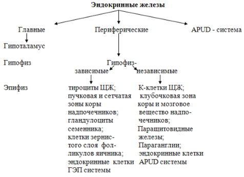 По характеру взаимодействия и принципу функциональной зависимости все железы эндокринной системы делятся на центральные (нейросекреторные ядра гипоталамуса, аденогипофиз гипофиза, эпифиз) и периферические, которые в свою очередь делятся на гипофиззависимые и гипофизнезависимые (остальные).