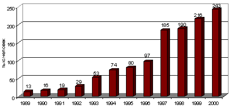 «Эпидемический характер распространения наркомании в стране, по оценке министра здравоохранения России, начался с 1995 года. Ежегодно стало выявляться по 50 -– 70 тысяч наркоманов. Темп роста наркомании среди детей вдвое обогнал показатели заболеваемости среди взрослых… Внутривенное использование наркотиков привело к распространению среди наркоманов ВИЧ-инфекции, тяжёлых психических расстройств и гепатитов. Среди 140 тысяч ВИЧ-инфицированных в стране более 95 процентов составляют люди, употребляющие наркотики». (6)
