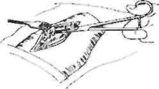 Рассечение фасции может быть произведено с помощью ножниц Купера. В образованное отверстие вводят сомкнутые лезвия ножниц и ими тупо отделяют глубжележащие образования. Затем под фасцию вводят одно лезвие ножниц, приподнимают им фасцию и производят рассечение.