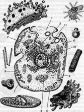 Еукаріотичні клітини належать до вищого типу, їх обов'язковою структурою є: цитоплазма, клітинна оболонка (плазмолема) та клітинне ядро, яке відокремлене від цитоплазми ядерною мембраною. У клітинах еукаріотичного типу в цитоплазмі є спеціальні структури — органели, які виконують окремі специфічні функції. До органел відносять мембранні та немембранні структури (рис. 1).