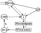1. Від рецепторів розтягнення легень (РРЛ) по аферентних волокнах блукаючого нерва спочатку до гальмівних вставних нейронів (ГВН) до інспіраторних нейронів;
