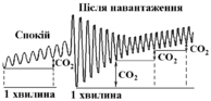 ифузія газів в тканинах підкоряється загальним законам (об’єм дифузії прямопропорційний площі дифузії, градієнту напруження газів в крові та тканинах). Площа дифузії збільшується, а товщина дифузного шару зменшується під час збільшення кількості функціонуючих капілярів, що має місце при підвищенні рівня функціональної активності тканин. В цих же умовах зростає градієнт напруження газів за рахунок зниження в активно працюючих органах Ро2 та підвищення Рсо2 (газовий склад артеріальної крові, як і альвеолярного повітря залишається незмінним!!!). Всі ці зміни в активно працюючих тканинах сприяють збільшенню об’єму дифузії О2 та СО2 в них. Споживання О2 (СО2) за спірограмою визначають по зміні (зсуву) кривої вверх за одиницю часу (1 хвилину).