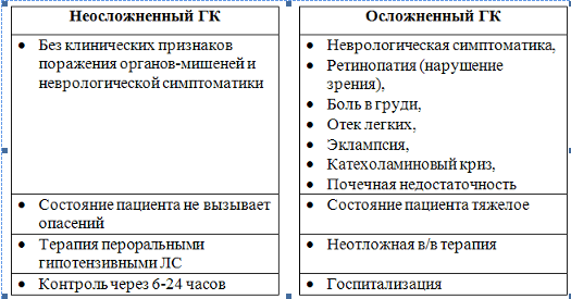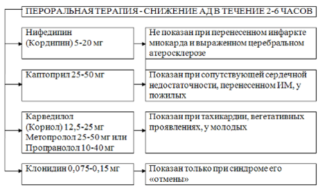 При неосложненном ГК, когда состояние больного не внушает опасения, АД снижают в течение 12-24 ч (оптимальным — на 15-20% от исходного в течение первых часов) с использованием пероральных гипотензивных препаратов короткого действия. При выборе перорального препарата для лечения ГК необходимо руководствоваться следующими критериями: