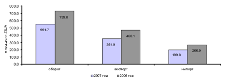 По данным таможенной статистики в 2008 году внешнеторговый оборот России составил 735,0 млрд.долларов США (с учетом данных о торговле с Республикой Беларусь) и по сравнению с 2007 годом увеличился на 33,2%, в том числе со странами дальнего зарубежья – 628,5 млрд.долларов США (рост на 34,0%), со странами СНГ – 106,5 млрд.долларов США (рост на 29,0%).