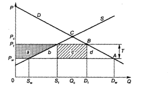 Линия D обозначает изменение величины потребления товара в зависимости от изменения цены Р. Линия S показывает предложение национальной промышленностью товара Q, в производстве которого страна не обладает сравнительным преимуществом (например, в стране Z — автомобилей).