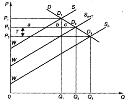 На рис. 2 линия WS характеризует динамику предложения товара на мировом рынке до введения таможенного тарифа; линия WSn — тенденцию предложения на рынке к моменту установления тарифа Т, когда поставщики, опасаясь потерять рынки, снизили цену Р на величину р|л, превышающую величину тарифа Т; линия WSn + Т— предложение товара на рынке после установления тарифа. Параметры q, Qi, Qi показывают соответствующее количество приобретенного товара, а линия D — потребность в импортном товаре, изменяющуюся в зависимости от цены.