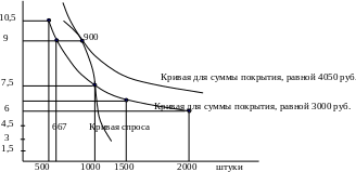 На графике суммы покрытия видно, что при цене 9 рублей объем реализации кофе уменьшится до 667 стаканчиков при постоянных значениях суммы покрытия и прибыли. Отдел сбыта на основе собственных оценок спроса планирует продать 900 стаканчиков кофе, в соответствии с этим снижение объема реализации, диктуемое рынком, будет меньше, чем это допускается графиком. Кривая функции спроса при цене 9 руб. за стаканчик кофе проходит через другую кривую, которая сдвинута вправо и соответствует более высокому уровню суммы покрытия (4050 руб.).