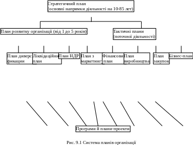 Результатом функціонування системи стратегічного планування є сукупність взаємозалежних планових документів, у яких відображені прийняті стратегічні рішення і розподіл ресурсів. Система планів служить формою матеріалізації планової діяльності організації але не головним її результатом. Головним є визначення цілей, стратегій, програм, розподіл ресурсів, що дозволяють організації у всеозброєнні зустріти майбутні зміни. А ці зміни служать змістовним результатом стратегічного планування і можуть включати плани НДР, диверсифікованості продукції, утвердження на ринку нової продукції, згортання і ліквідацію нерентабельних виробництв тощо. На рис. 9.1 представлена концептуальна схема системи планів, що повинна розробляти організація в умовах ринкової економіки