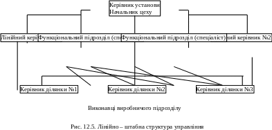 При лінійно-штабній структурі управління в керівника – єдиноначальника є штаб, що складається з функціональних підрозділів ( відділів, бюро, груп, окремих фахівців), що відповідають визначеної функції управління (рис. 12.5.).