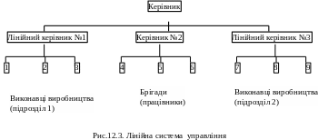 Головною рисою лінійної структури управління є зосередження усіх функцій в одних руках і прямий вплив на виробництво. У цьому випадку система ланок управління збігається із системою виробництва. На чолі кожного виробничого колективу стоїть керівник – єдиноначальник, якому безпосереднього підлеглі всі працівники. Підлеглі виконують розпорядження тільки свого безпосереднього керівника. При лінійній системі управління здійснюється лінією таким чином, що усі функції управління (технічні, економічні, організаційні й інші) належать тільки керівнику. Лінійна структура управління характеризуються кількома рівнями управління (рис 12.3.)