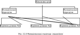 Функціональна структура управління будується на основі розмежування функціональних виробничих обов'язків і виконання їх різними спеціалістами. У цій системі більша увага приділяється поділу робіт по функціях, чим на відносинам між начальниками і підлеглими ( рис 12.4.).