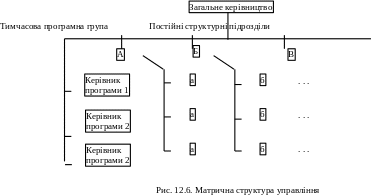 У матричній організації члени проектної групи підкоряються як керівнику проекту так і керівникам тих функціональних відділів у яких вони працюють постійно. Керівник проекту має проектні повноваження.