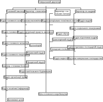 Для виконання функцій управління виробництвом створюється апарат управління. Організаційно він оформляється в заводоуправління. Розрізняють цехову, безцехову, корпусну, виробничу організаційну структуру. Проектування й удосконалювання виробничих структур може здійснюватися за допомогою пошукового, аналітичного, нормативного, типового чи блокового методу, що дозволяє закріпити за посадовою особою відповідальність за функціонування відповідного блоку. Структура повинна забезпечувати стандартний рівень керованості: кількість філій, структурних підрозділів, що замикаються на президенті/генеральному директорі встановлено від 3-5 до 12; для віце-президента/ зам. генерального директора – від 6 до 8; у керівника структурного підрозділу може бути до 10 підлеглих; число робітників у бригадах – від 5 до 15 осіб.