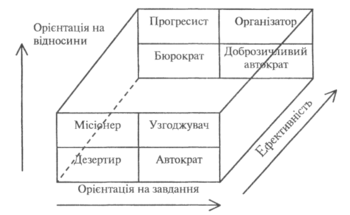 3) доброзичливий автократ — менеджер, який має високий рівень орієнтації на завдання і низький — на стосунки в ситуації, що спричиняє таку поведінку. Тому такий менеджмент більш ефективний. Це людина, яка знає, чого хоче і знає, як отримати необхідне, не викликаючи образи чи обурення;