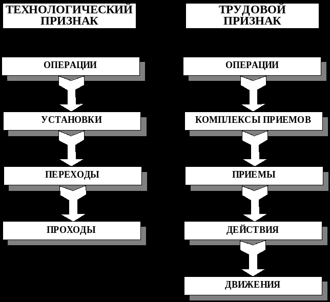 Операции расчленяются на отдельные элементы по технологическому и трудовому признакам (рис. 2).
