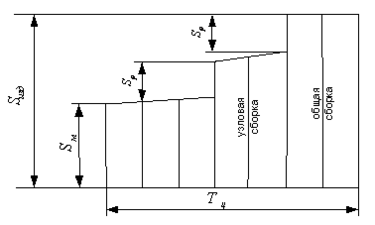 Деятельный метод расчета среднего коэффициента нарастания затрат (4.7) заключается в том, что по каждому виду затрат в незавершенном производстве – основной материал, полуфабрикаты, комплектующие изделия, заработная плата и прочие затраты – определяется средневзвешенным пребыванием их в общем цикле изготовления изделия. Здесь материалы поступают в производство при запуске, а комплектующие изделия в процессе узловой и общей сборки (рис. 4.2).