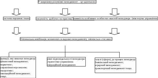У широкому розумінні, яке певною мірою узагальнює різні точки зору, менеджмент – це одночасно система наукових знань, мистецтва та досвіду, втілених у діяльності професійних менеджерів для досягнення цілей організації шляхом використання праці, інтелекту і мотивів поведінки інших людей. У вузькому розумінні, яке у нашому випадку переслідує конкретну мету – вивчення дисципліни “Менеджмент”, цю категорію можна визначити як процес планування, організацію, мотивацію й контролю організаційних ресурсів для результативного та ефективного досягнення цілей організації. Детальний розгляд змісту, складових елементів, етапів та інструментів реалізації функцій управління і взаємозв'язків між ними покладено в основу навчальної програми дисципліни “Менеджмент”.