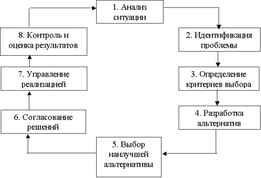 Процесс принятия решений – это циклическая последовательность действий субъекта управления, направленных на разрешение проблем организации и заключающихся в анализе ситуации, генерации альтернатив, принятии решения и организации его выполнения.