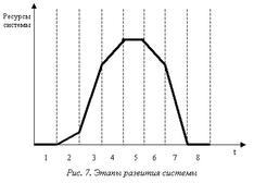 Развитие организации рассматривается как поэтапный процесс, проходящий ряд последовательных фаз (стадий). Относительно количества фаз (стадий) в литературе существуют разные мнения. А. А. Беляев и Э. М. Коротков выделяют следующие этапы жизненного цикла организации: внедрение, рост, зрелость, насыщение, спад, крах148. У Карлофа можно увидеть похожие стадии: внедрение, рост на первом этапе, рост на последующих этапах, зрелость, спад149. Э.А. Смирнов обосновывает развитие с позиций жизненного цикла любой системы, состоящем из восьми этапов: порог нечувствительности (1), внедрение (2), рост (3), зрелость (4), насыщение (5), спад (6), крах (7), ликвидация или утилизация (8). Данные этапы мы показали на рис. 7.