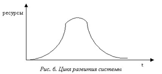 Цикл в наиболее общем виде имеет вид синусоиды и состоит из двух ветвей: левая отражает рост системы, правая показывает деградацию системы, происходящую с обратным насыщением (рис. 6).