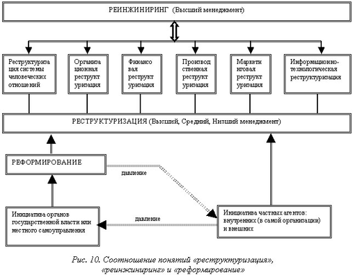 Исходя из охвата организации внедряемыми изменениями мы различаем два вида реструктуризации: частичную и полную (реинжиниринг) (рис. 10).