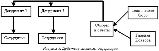 Помимо линейной и функциональной систем в работах, посвященных теории организации в 30-х гг. ХХ в. рассматривается система децернации или система децернентов, заимствованная из практики немецких железных дорог. В децернированном аппарате разделяется ответственность за оперативную работу и ответственность за техническую разработку вопросов деятельности компании и оформление этой деятельности. Децерненты (от лат. decerno — решаю) — это сотрудники компании, наделенные правом самостоятельного принятия решений по определенному, закрепленному за ними кругу вопросов. При этом они не занимаются техническими вопросами — это компетенция Технического Бюро и Главной Конторы, в обязанности которых входит подбор и анализ статистических данных, подбор фактического материала и составление обзоров. Начальник Главной Конторы не подчиняется децернентам. Децерненты получают обзоры и отчеты Главной Конторы, систематизируют их, оформляют и отдают распоряжения. Рис. 3 показывает, как действует система децернации.