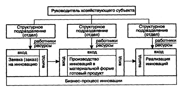 Бизнес-процесс инноваций выражается множеством видов организационно-управленческой деятельности внутри предприятия, каждый из которых имеет свой вход и выход. Иначе говоря, бизнес-процесс инноваций есть упорядоченная совокупность работ во времени и пространстве с указанием их начала и конца. Этот бизнес-процесс в упрощенном виде показан на рис. 1.