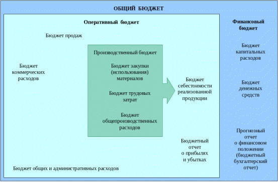 Оперативный бюджет - показывает планируемые операции на предстоящий год для сегмента или отдельной функции компании. Он также называется текущим, периодическим бюджетом. Оперативный бюджет включает в себя бюджетный (прогнозный) отчет о прибылях и убытках, который, в свою очередь, формируется на основе таких бюджетов, как бюджет продаж (бюджет доходов), производственный бюджет (с детализацией в отдельных бюджетах по всем элементам производственных затрат), бюджет товарно-материальных запасов и бюджеты коммерческих и общих и административных расходов.