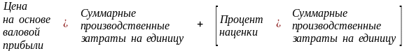 Для установления цены с использованием этого метода в качестве расчетной базы использует валовую прибыль, которая определяется как разница между объемом реализации продукции (выручкой от реализации) и себестоимостью реализованной продукции. Устанавливаемая цена должна обеспечить получение желаемой прибыли и покрыть все затраты, которые не учтены при расчете валовой прибыли. Этот метод можно легко применить, поскольку информацию о производственных затратах, операционных расходах на единицу продукции легко получить из учетных данных и нет необходимости деления затрат на постоянные и переменные.