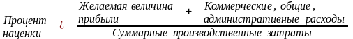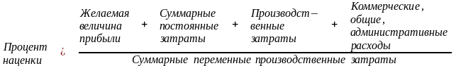 Цена устанавливается на основе процентной надбавки ко всем переменным производственным затратам. Она должна покрыть всю сумму затрат и желаемой прибыли, указанную в первой формуле.