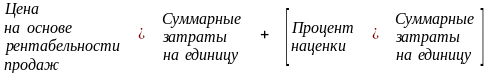 При использовании метода рентабельности продаж, процентная наценка включает только желаемую величину прибыли. Все затраты должны быть распределены по единицам продукции. Так как накладные (коммерческие, общие и административные) расходы труднее отнести на конкретные виды продукции, чем переменные и постоянные производственные затраты, то для их распределения можно использовать произвольные базы. Однако, такое произвольное распределение коммерческих, общих и административных расходов может привести к ошибкам в определении цены товара, поэтому метод ценообразования на основе рентабельности продаж может быть использован в качестве исходной цены в решении проблемы ценообразования. Для расчетов используются следующие формулы: