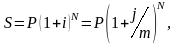Если взносы в размере R будут вноситься на депозитный счет P раз в году в начале каждого расчетного периода, и на них m раз в году будут начисляться сложные проценты по номинальной годовой ставке j, сумма всех взносов с начисленными процентами через n лет будет равна: